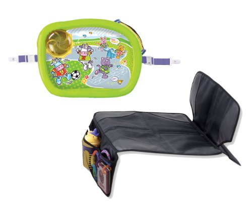 With the Auto Seat Protector and Travel Tray by Munchkin you will be all set to hit the road with your little one. The Auto Seat Protector helps keep your seat neat and baby's seat in place. Your baby's car seat can sometimes slip and slide, but this textured seat protector offers your child safety, while it protects your car's seat from indentations and dirt. It has expandable front pockets to hold bottles, food and toys, so your back seat will stay neater and cleaner. Features seat belt slots and cutouts for latch lower anchors. The Travel Tray helps keep your child entertained in the car perfect for drawing, reading, playing and more. The built-in side walls help keep items from sliding off the tray and a built-in snack holder keeps snacks secure and within arm's reach.