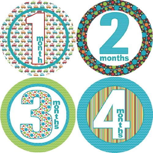 These monthly stickers are a perfect way to catch a special moment in your baby's life without having to buy a new graphic bodysuit each time. Just peel the sticker and place on a shirt of your choice each month. Whip out the camera and snap away! Great gift for parents to capture monthly birthday photos! Remove after photo taking and before washing. Reuse sticker in memory books! This "On the Go" design for boys features polka dots, stripes, and cars, in blue, red, green, and orange.
